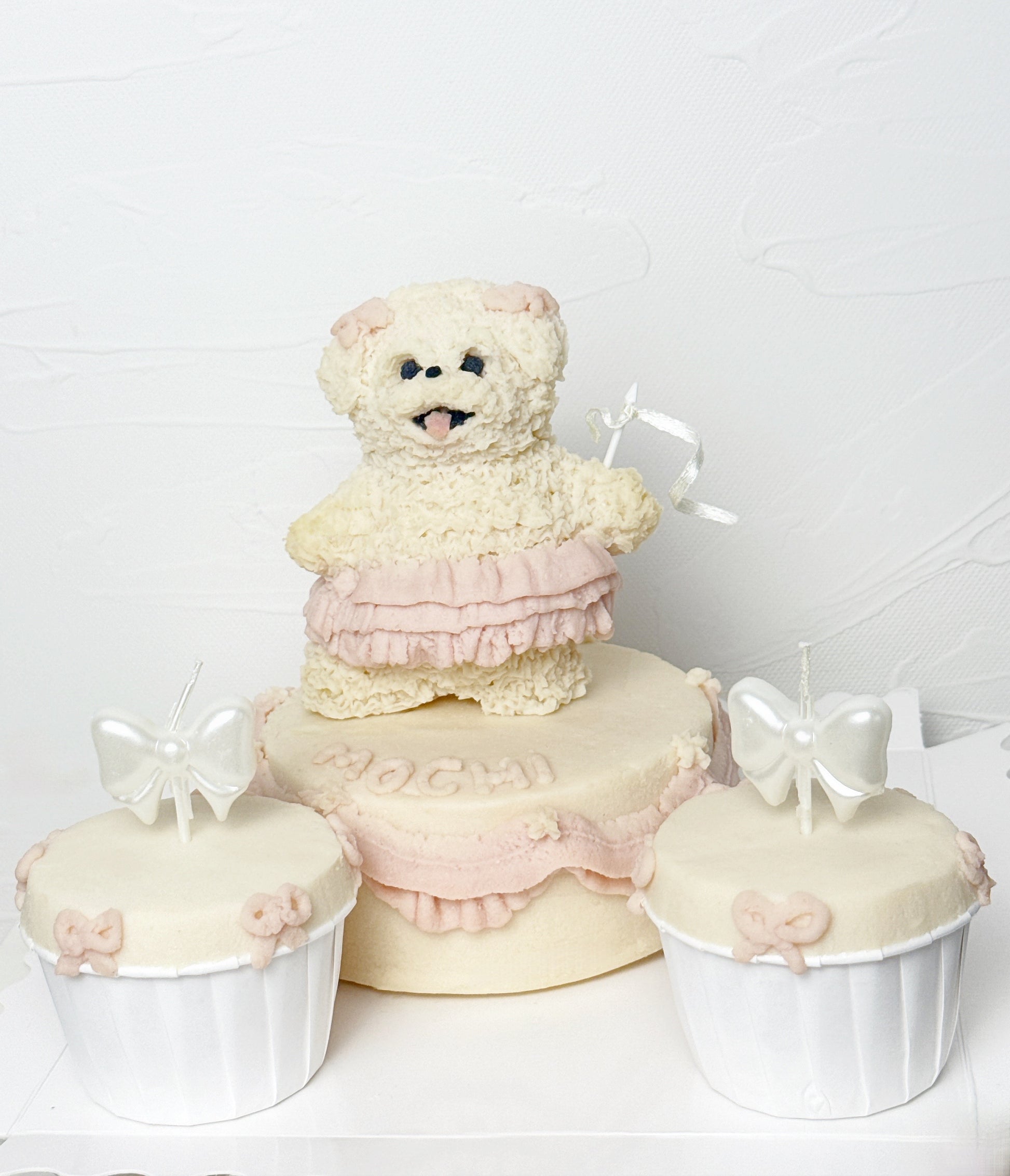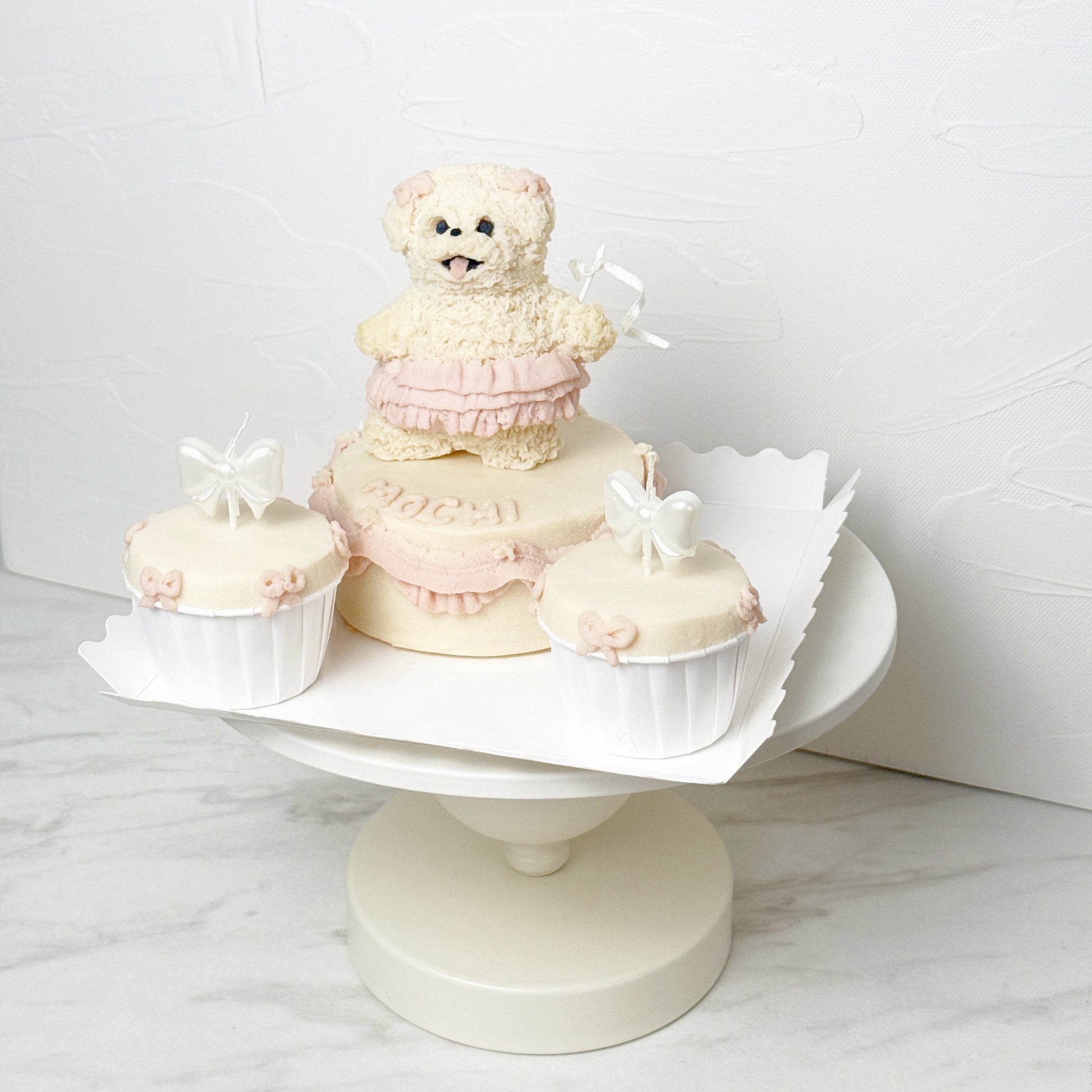 Twirl into celebration with our ballerina cake set! Featuring a tutu-clad 3D pup perched atop a soft pastel stage, this cake is perfect for stylish pets. Comes with two matching bow-topped cupcakes for extra charm. Handmade with love - because every birthday star deserves their spotlight moment.
