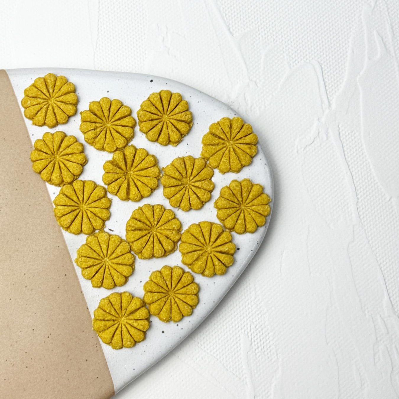 Brighten your pet’s day with a golden crunch! Pumpkin Paw-sons are cheerful, flower-shaped biscuits lovingly baked with nourishing superfoods — perfect for paws who deserve both flavor and function. Made with real pumpkin, soothing turmeric, and gut-friendly oat flour, they’re as wholesome as they are adorable.